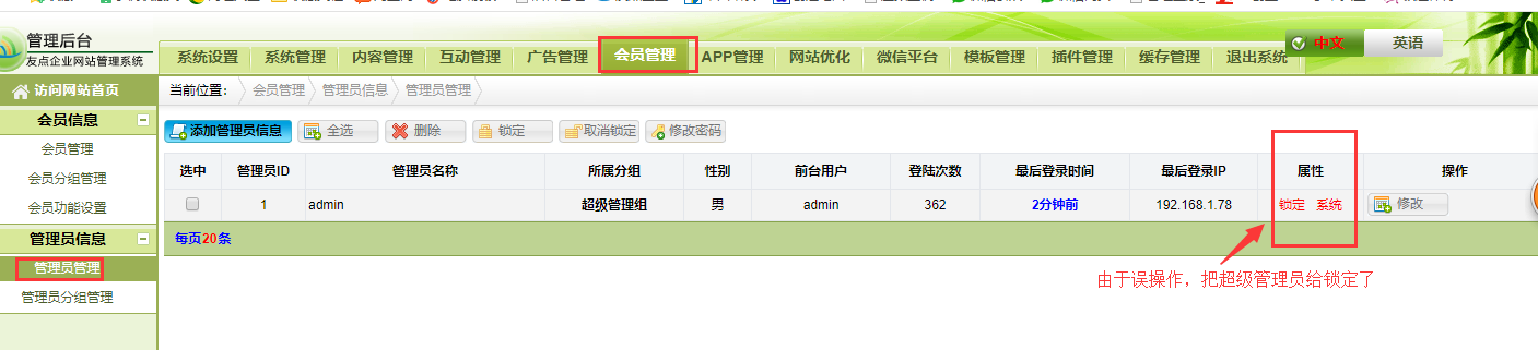 這里經(jīng)常會有用戶無意間操作點擊把后臺超級管理員給鎖定了,導(dǎo)致無法進入后臺,這種情況應(yīng)該怎么處理呢?