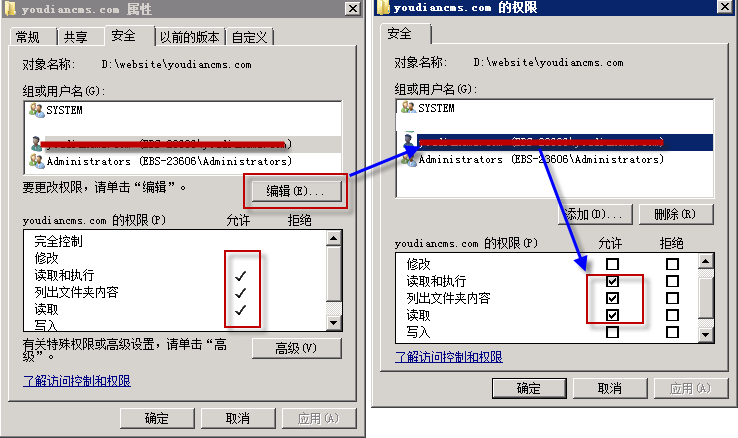 打開網(wǎng)站的目錄,右鍵單機(jī)網(wǎng)站跟目錄,選擇【屬性】,選擇網(wǎng)站對(duì)應(yīng)的訪問賬號(hào),然后點(diǎn)擊【編輯】按鈕,根據(jù)需要來(lái)設(shè)置是否選擇寫入權(quán)限,如下圖所示: