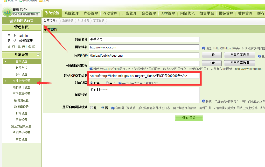 第一:打開后臺(tái)網(wǎng)址進(jìn)入系統(tǒng)設(shè)置-基本設(shè)置 如下圖頁面,在箭頭地方添加如下代碼:
