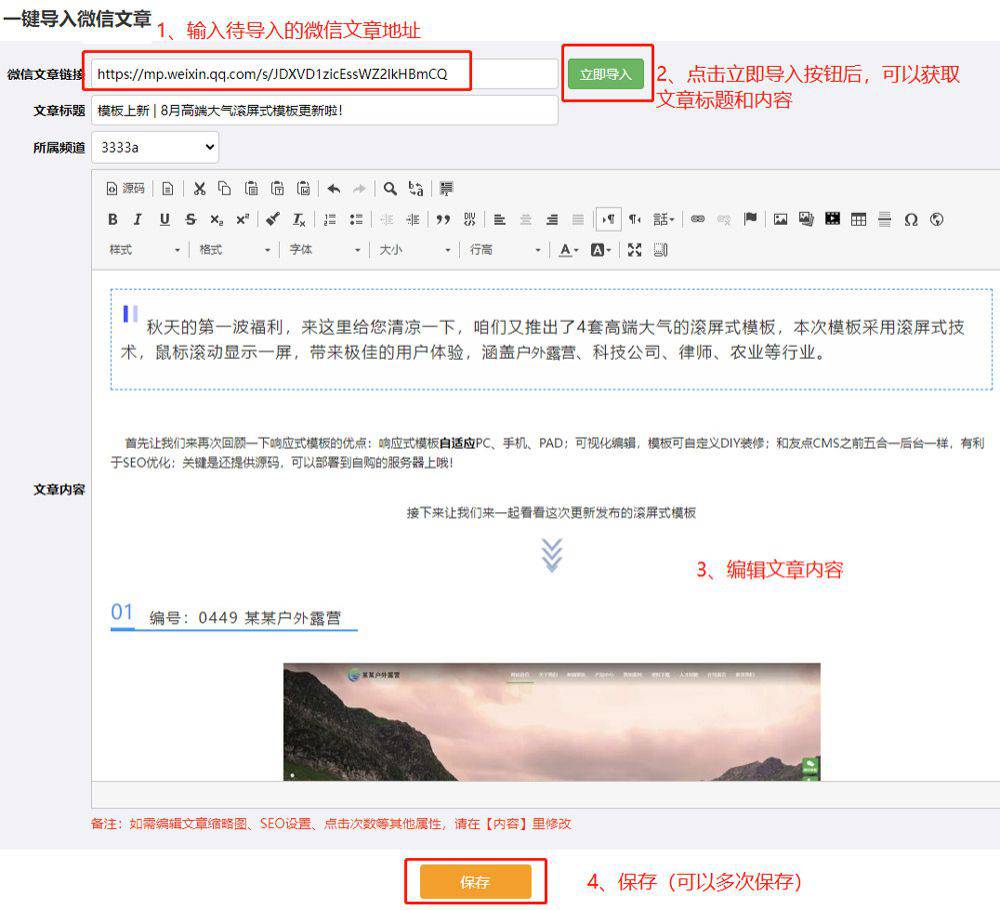 1)點(diǎn)擊按鈕導(dǎo)入后,首次點(diǎn)擊【保存】為添加一篇新的文章,再次點(diǎn)擊【保存】為更新當(dāng)前文章