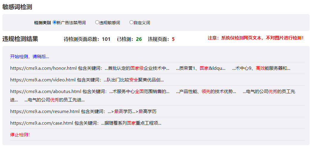 點擊【立即檢測】按鈕后,開始全站關鍵詞檢測。界面會顯示當前待檢測頁面總數(shù)、已檢測頁面數(shù)、違規(guī)頁面數(shù);并顯示詳細的檢測結果,如果存在疑似違規(guī)詞,將標紅顯示。