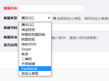 如下圖,輸入名稱,選擇類型,客服號碼,保存后前端則會顯示出對應(yīng)的圖標(biāo)和聯(lián)系方式。