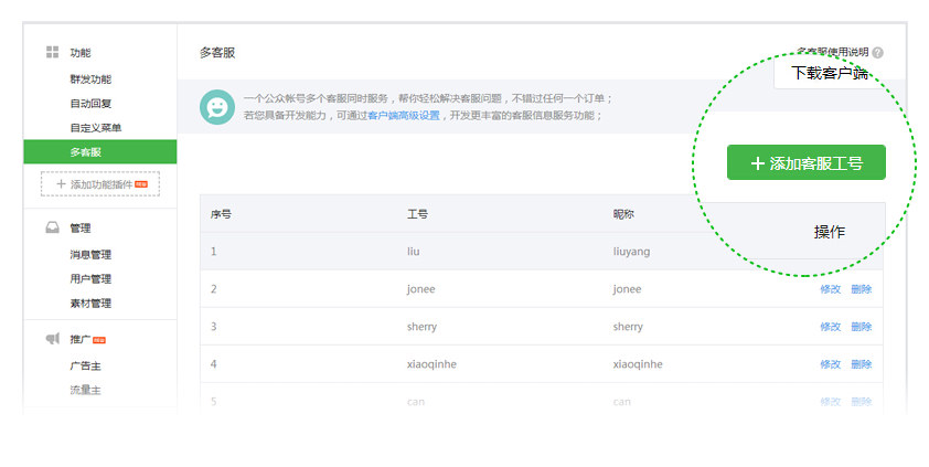 商戶在微信公眾平臺(http://mp.weixin.qq.com)開通人工客服權(quán)限以后,于“功能-多客服”中,添加客服。